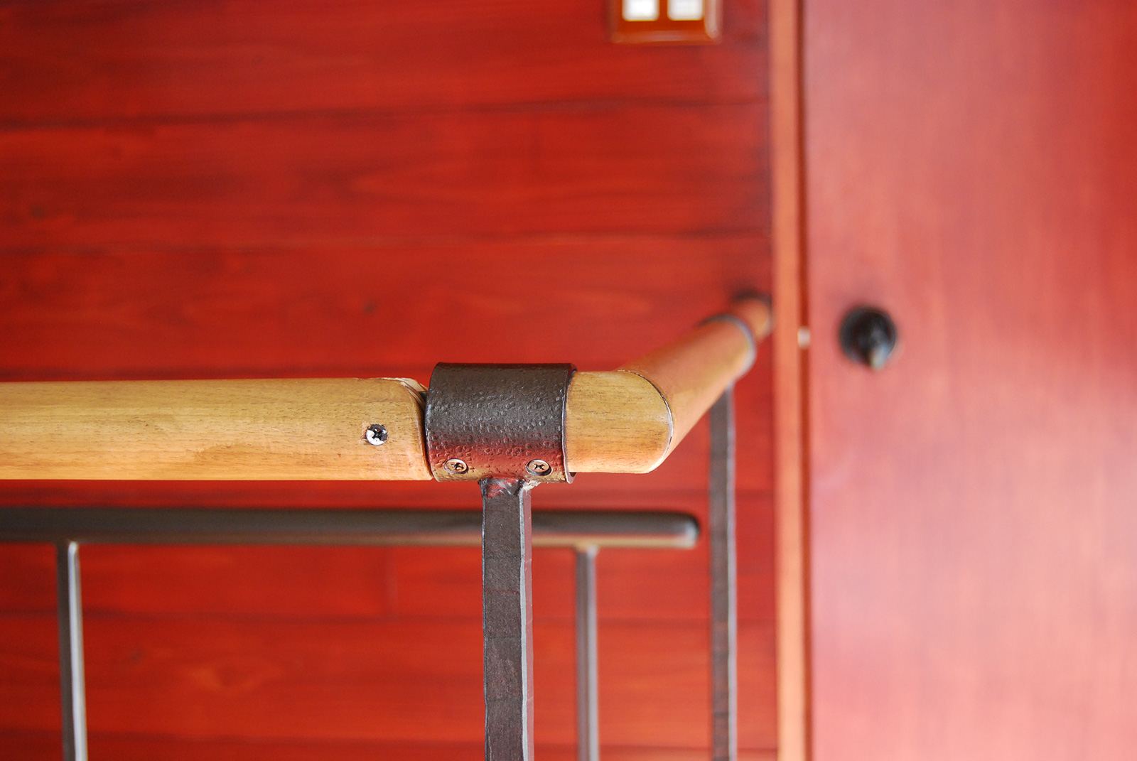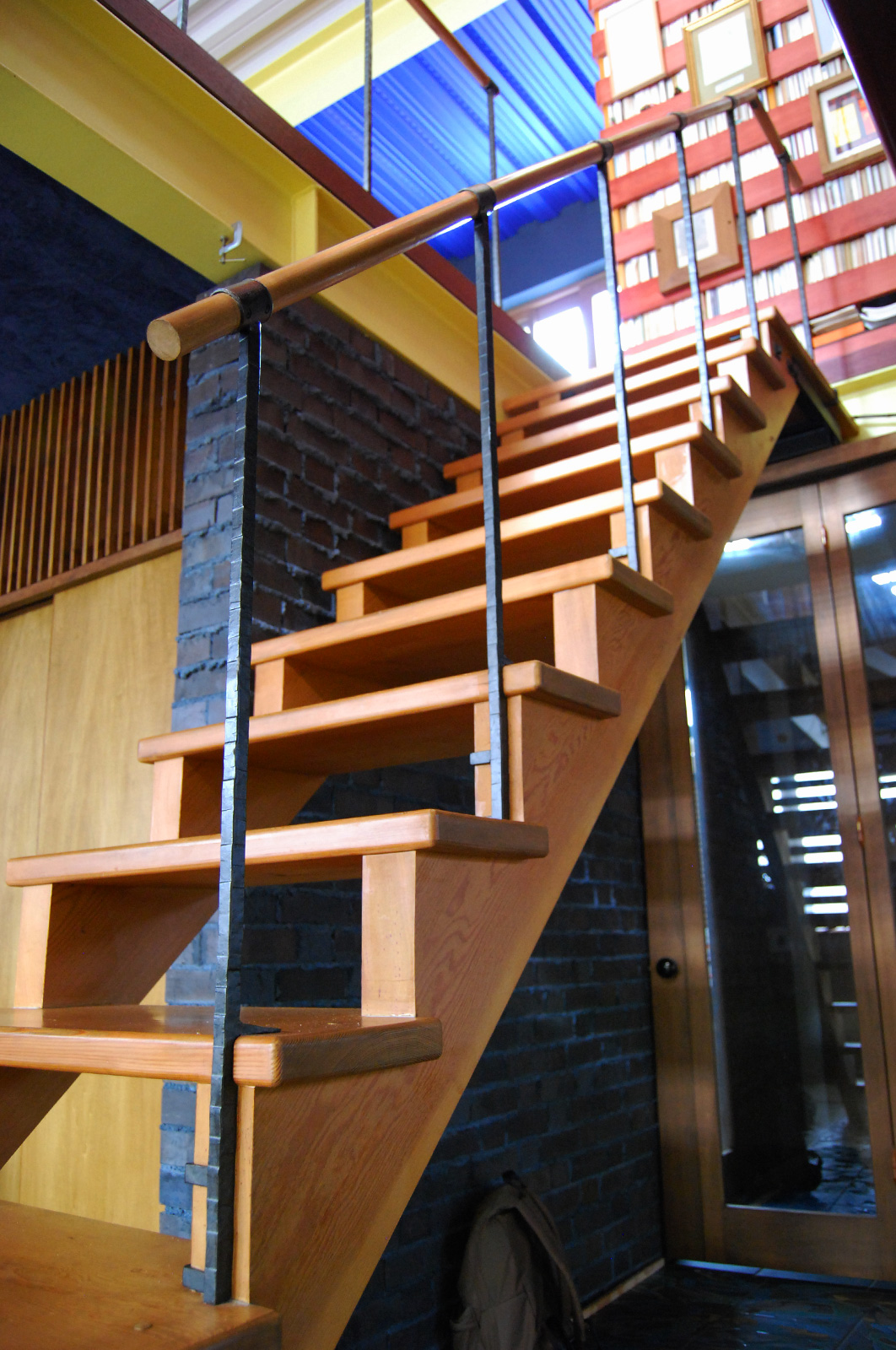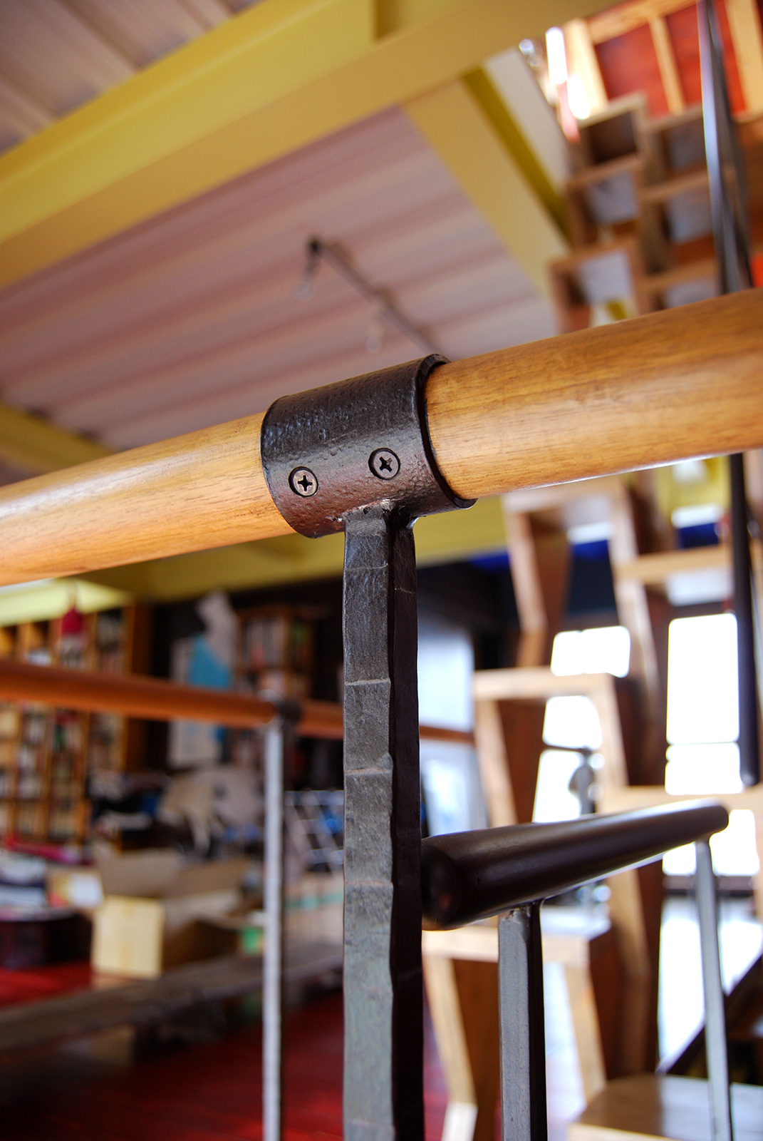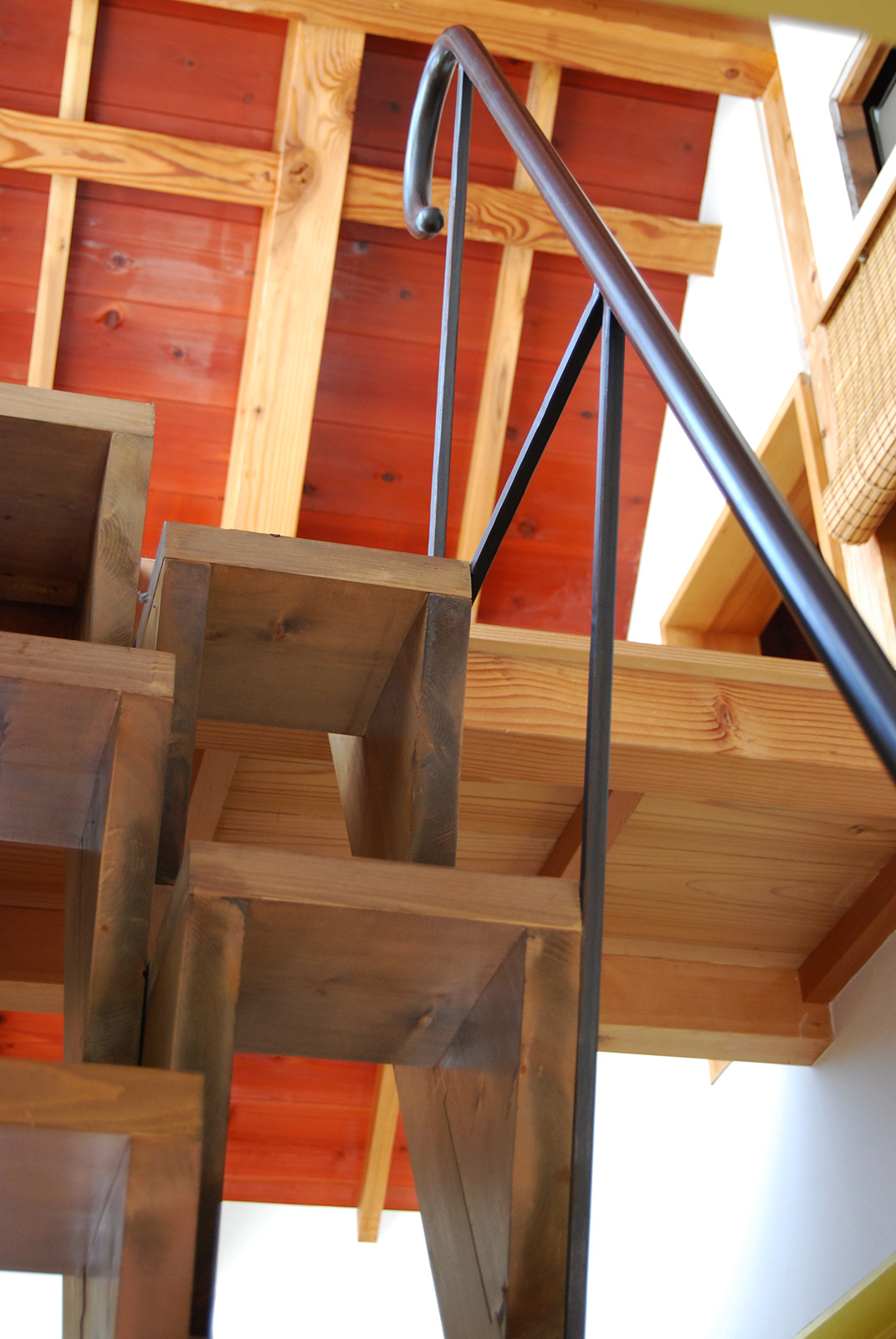 アイアンの階段手すりを制作、取り付けをしました。 笠木は丸パイプ、端部は曲げ加工をして、とても手になじみやすい形になりました。 二階から三階への階段にささら部分取り付けをし、吹き抜けから見上げると全体の形が見えます。 仕上げはウレタンで黒のメタリック塗装を施しました。design/おかざき乾じろ