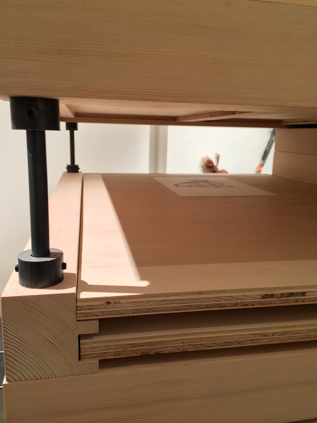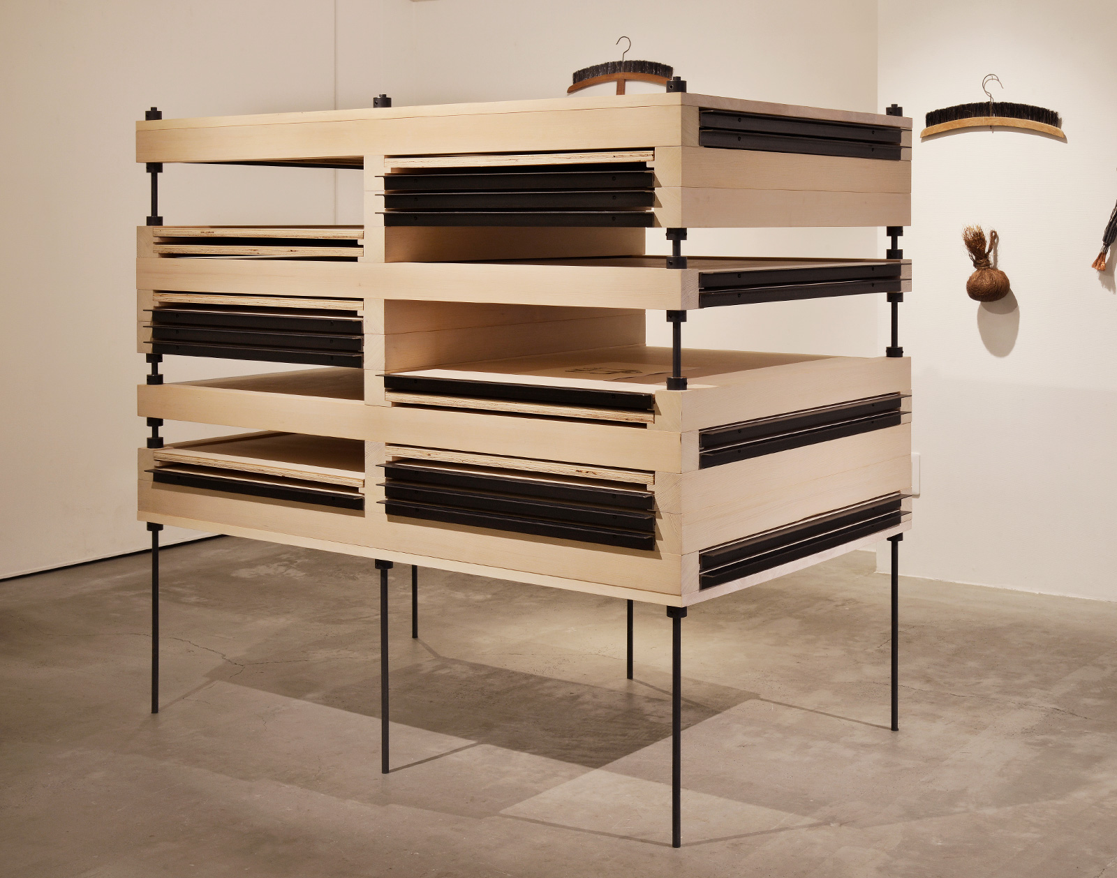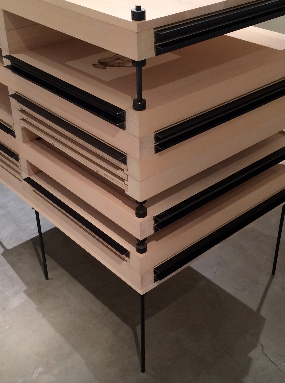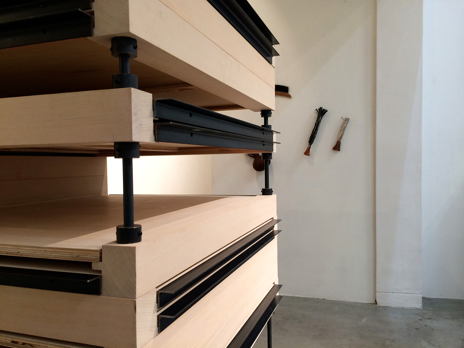 美術家の吉田和司氏のドローイング作品を展示、収納するための特殊シェルフを制作しました。 金属パーツ制作、木部加工、組み上げサポートを行いました。 全体が貫通した6本の丸鋼に支えられ、角材が交差した構造の中に引き出しが納まっています。 design,photo/吉田和司