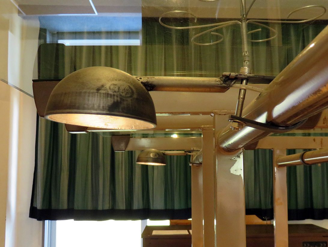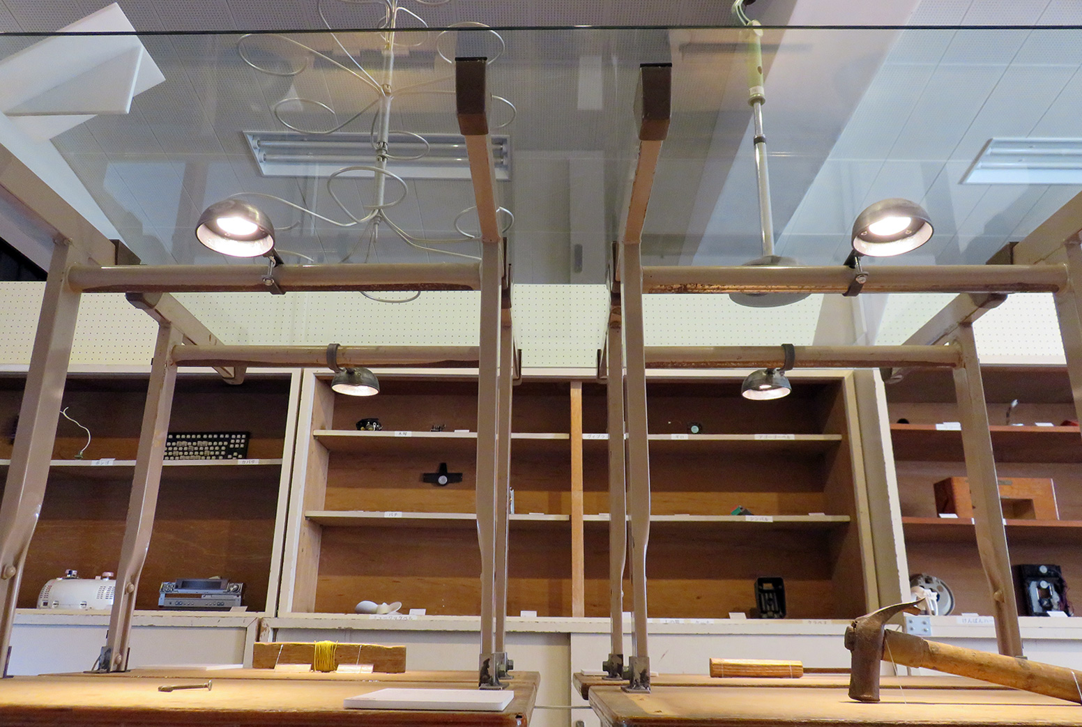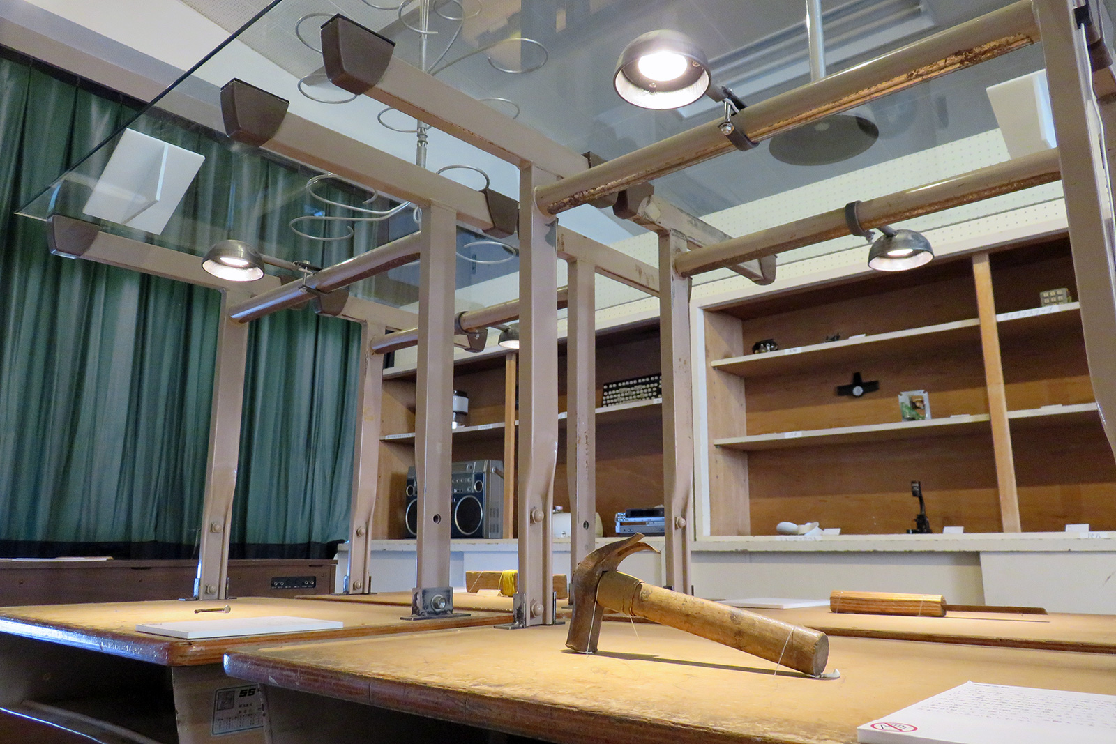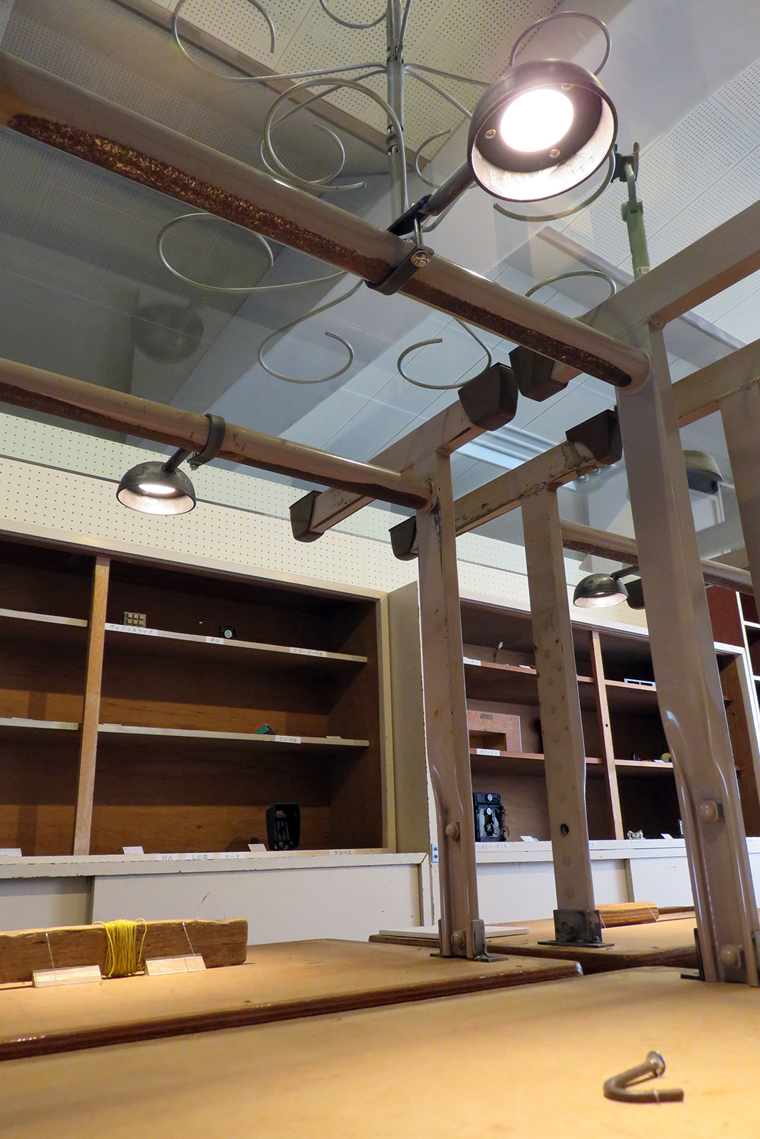 作品展示用として依頼を受け、照明を制作しました。 今回はサイズ、ボリューム感などのイメージを打ち合わせして、全体のデザインと設計をさせていただきました。 半球キャップという部材を使ってシェードにし、中にLEDランプを入れてあります。 展示の条件として、取り付け方法はパイプにバンド状に締め付けて固定しました。 丸くお玉のような姿と、鉄の生地の表情が周りとうまくなじんでいます。