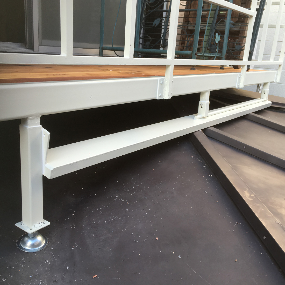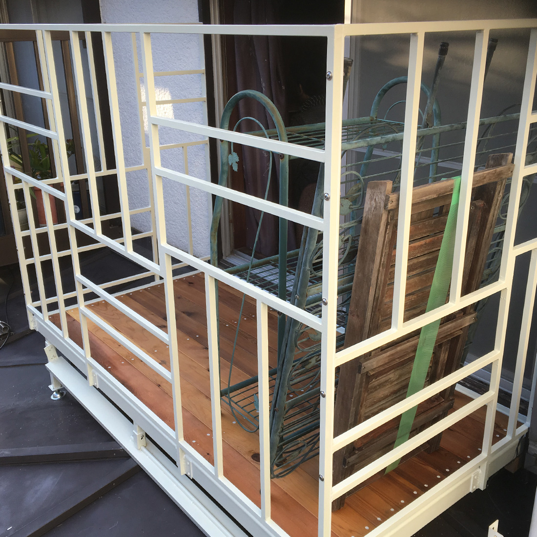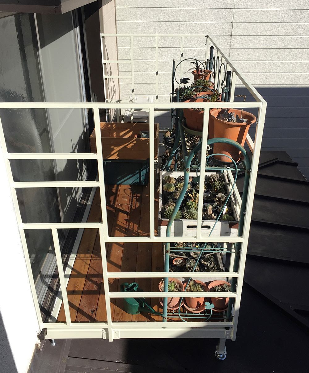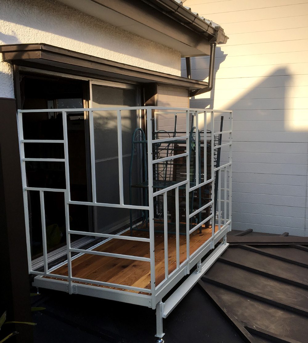 ご依頼を受けてバルコニーのデザイン、制作をいたしました。屋根の傾斜に合わせた脚部分が、屋根の水切りや板金の繋ぎと干渉しないように納めました。 鉢植えを置いて使われるとのことでしたので、依頼主様とご相談して少しクリーム色が入った白色に塗装いたしました。植物の緑がとても映えると思います。 柵部分の鋼材には16ミリの角鋼を、床面には湿気に強いシダー材を使いました。